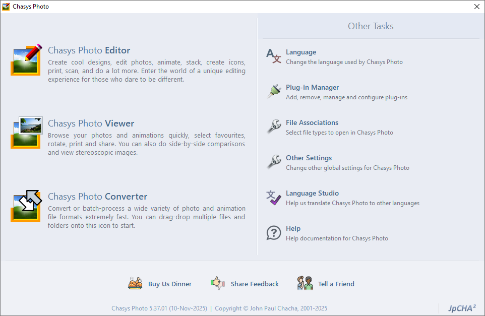 The suite is made up of three primary applications, with several support applications in the background. These three primary applications are listed below; please click the icons or titles for more information. In a typical configuration, the window above, called the Chasys Photo Lobby, is the first screen that is shown when you start Chasys Photo. From here, you can start one of the three aforementioned application or choose from a list of other common tasks. You may also drag-drop files and folders onto the application icons to open them.