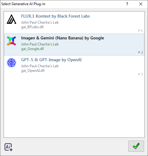 You will then be presented with a dialog box where you can select the Generative AI plug-in to use. If the AI engine implemented by the plug-in requires configuration such as the provision of an API key, the plug-in will display a configuration dialog box where you can do so. Once this is done, the AI engine will be triggered to do the requested operation.