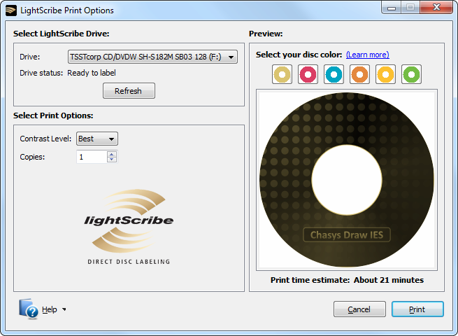 Choose LightScribe Direct Disc Labeling then click Send. Chasys Photo will link to the dev_LightScribe plug-in, which will link to the LightScribe print drivers and coordinate the printing process. You'll normally be presented with a dialog box where you can set the print options: