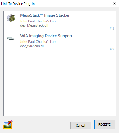 To use the MegaStack™ Image Stacker, go to the File menu and select Import from Device. You'll be presented with a dialog box where you can choose the device plug-in you want to import an image from. Select "WIA Imaging Support" and then click "RECEIVE".