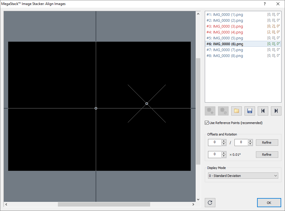 The first layer is used as the reference, and always has the offsets (0,0). All other layers are aligned against this layer, with offsets specified in pixels. MegaStack™ Image Stacker can align the images for you based on reference points that you provide; you can also align the images manually. The following functions are supported: