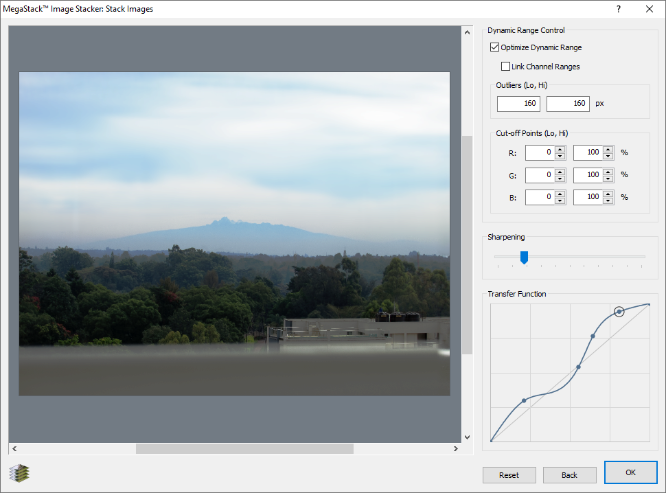 The sliders for sharpening and gamma operate on the high-precision summation data to minimize rounding errors. The “outliers” settings determine how many pixels can be treated as outliers caused by noise or other defects and thus omitted from dynamic range calculations. Ten outliers per mega-pixel is usually a good rule of thumb. The cut-off points determine the portion of the range to use; the default is to use the entire range (0% – 100%).
