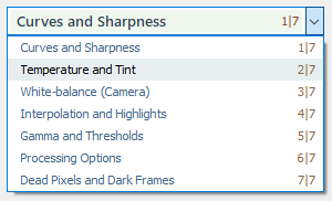 The dialog box has several pages of settings; you can switch between these by using the drop-down selection at the top of the dialog box (see illustration below). At the bottom of the window, we have 5 buttons for Help, Settings, Reset, Apply/Preview and Done, in that order: