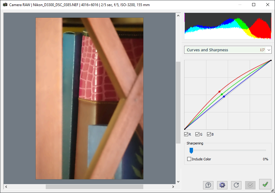 The Sharpness adjustment sharpens the image; by default, it only sharpens the luminosity to give results that are more aesthetically pleasant. If you wish, you can make it sharpen both luminosity and chromaticity by selecting the “Include Color” option.