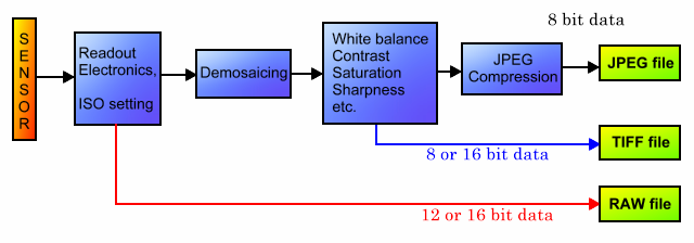JPEG images are typically saved using a lossy compression format (leading to quantization and compression artifacts), and use gamma-compressed 8-bit values to store that data. Raw formats are typically either uncompressed or use lossless compression, and typically have 12 or 14 bits of intensity information. Putting the 12 bit data in a 8 bit file is like pouring a 3 liters of liquid into a 2 litre container. It won't all fit so you have to throw some away. Since the data is not yet rendered and clipped to a color space gamut, more precision may be available in highlights, shadows, and saturated colors. The greater precision also means that large transformations, such as increasing the exposure of a dramatically under-exposed photo, result in less visible artifacts when done from raw data than when done from already rendered image files. As a result, the maximum amount of image detail is always kept within the raw file.