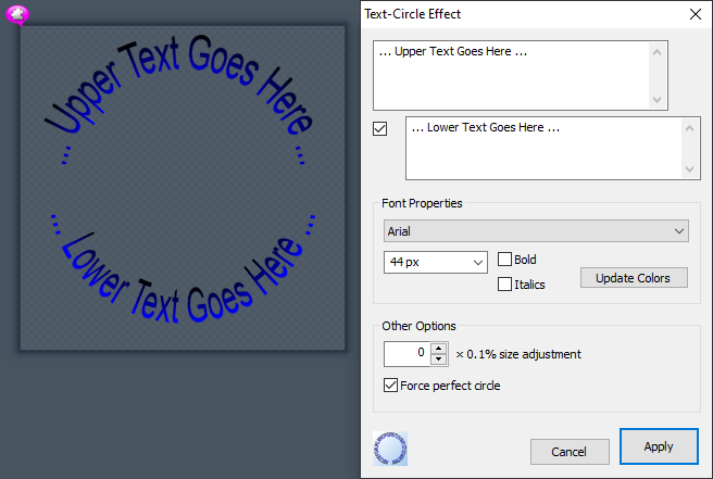 The plug-in will then render the circular text on the current layer and present you with a dialog box where you can enter text and set various options. In general, you have two options for rendering text; either as one long line that spans the entire circumference of the circle, or as two lines spanning one half of the circle each. You also have options for the font, font size and font properties.