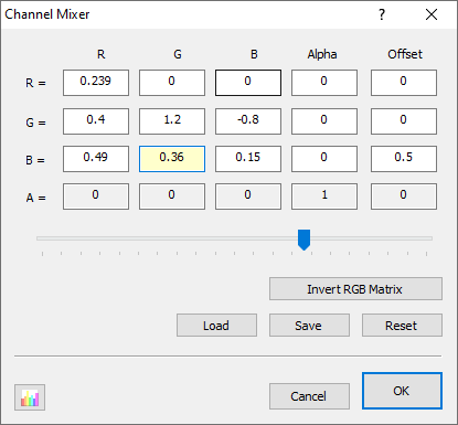 As you can see, the values in the first row determine the resulting red value, the second row the green value, the third row the blue value, and the fourth row the alpha value. You can also see that the values in the first four columns are multiplied with the source red, green, blue, and alpha values, respectively; while the fifth column value (offset) is added as is.