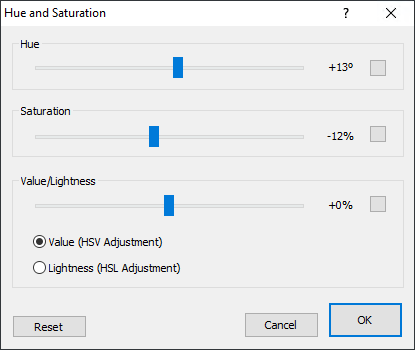 Adjusting hue changes the colors in the image, value affect intensity and lightness affects brightness. Note that you can only work with either the value (HSV) or lightness (HSL) at a time.