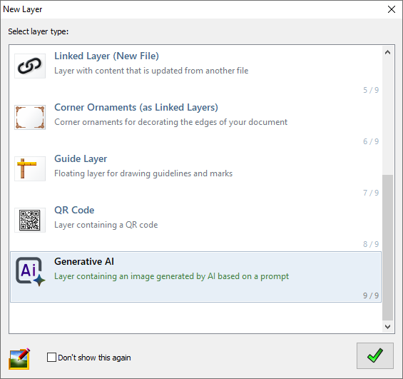If you want to add an AI generated background to your image or you’d like to add an element to the image that is AI -generated, the same logic applies – instead of a big AI menu, you just add a new layer as you would normally do, then, instead of choosing a normal layer or a text layer, you choose a generative-AI layer: