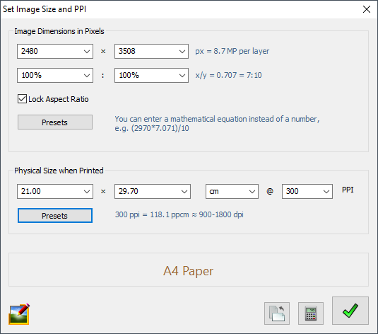 The user interface supports automatic calculation, so you can enter math equations instead of actual values, for example 2*(1024+16). Additionally, it automatically detects standard paper and screen sizes and displays their names at the bottom to guide you.