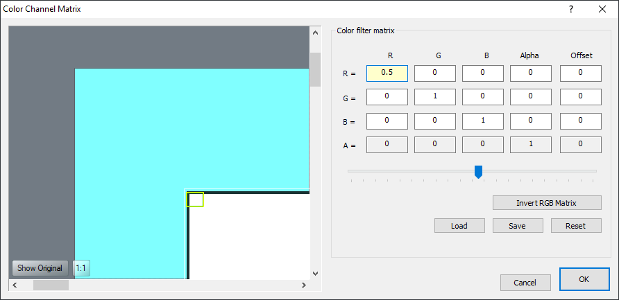As you can see, the values in the first row determine the resulting red value, the second row the green value, the third row the blue value, and the fourth row the alpha value. You can also see that the values in the first four columns are multiplied with the source red, green, blue, and alpha values, respectively; while the fifth column value (offset) is added as is.