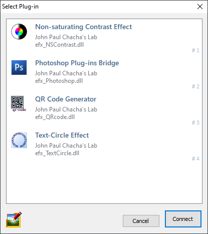 New effects can be added to Chasys Photo using plug-ins. Some plug-ins are bundled with it, but you may add your own if you wish. Effects exposed by plug-ins can be access through the menu Effects > External Plug-ins.