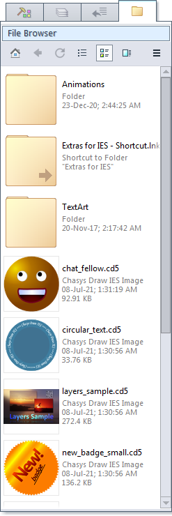 This is the File Browser tab; it allows you to easily navigate and load files. The home page of the file browser lists your drives, common folders of interest and the user favourite folders. The Chasys Photo default folder is also listed. You may open files and folders by clicking them. To add a file as a new layer in the image you are working on, right-click instead.
