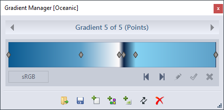 A points gradient is created using the New button. This creates a gradient with the current colors as the end points, you can then add points by left-clicking the point of interest. The new point is created with the current color. You can edit existing points by selecting them. You do this by clicking the point. The current color changes to that of the point; you can then move the point as you wish or change its color by changing the current color and alpha. You can fine tune the movement using the arrow-keys or apply the finest tuning using arrow+shift. Tab cycles selection through the point. You can deselect by tapping Escape or clicking the navy blue return button . Points can also be deleted, this is done by right-clicking them.