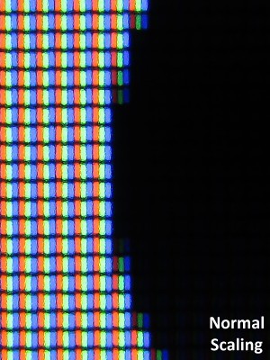 The images below are close-up photos of an LCD screen while displaying an image that has been scaled using sub-pixel rendering and normally scaling; side by side. As you can see in the first photo, the subpixel rendering engine is using each subpixel as a separate sampling point, giving 3 times the horizontal resolution of the normal image. The vertical resolution remains unchanged.