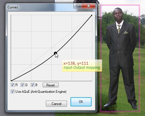 What I basically did here was to make the image darker, to match the relatively dark background (note the color of the suit). In photographic terms, we can say I reduced the image’s exposure. If you want to do this in a non-destructive way, you can do so by using an adjustment layer – just right-click the layer, select Adjustments, then select Attach Adjustment Layer. In the adjustment layer properties window, select Curves then adjust.