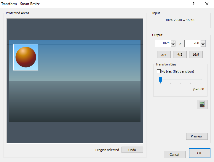 Smart Resize performs content-aware image resizing on the current layer, allowing you to resize an image in such a way that only unimportant details are resized while important details remain untouched. You can highlight important areas in the image as shown below (left-click, drag then release). You can also set the output size and slope bias, which controls the hardness/softness of the boundaries between resized and unresized regions of the image.