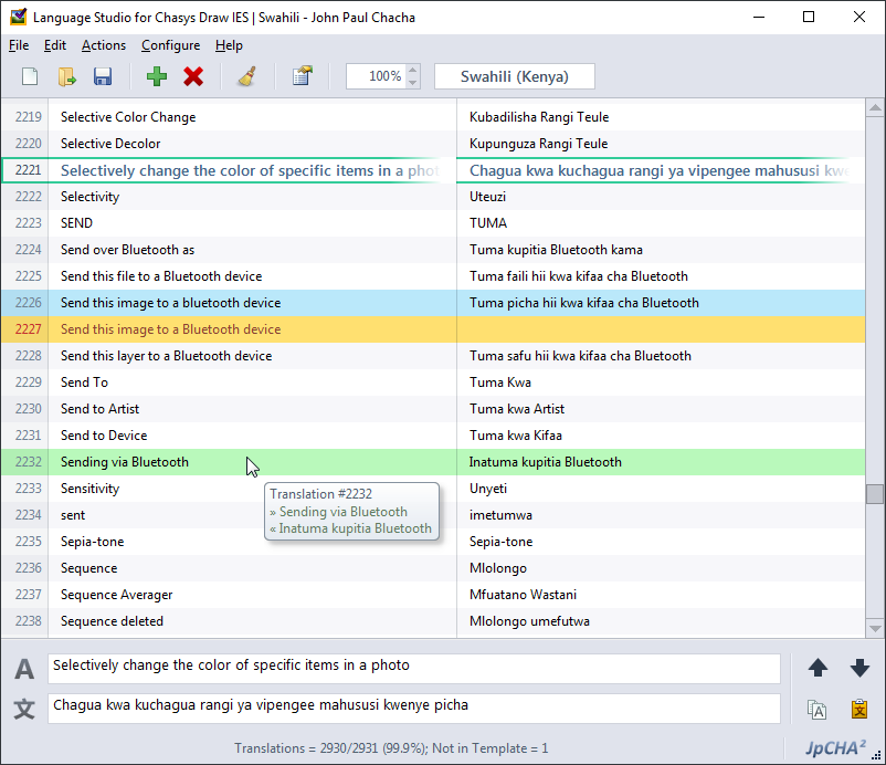 Chasys Photo supports user interface languages other than English via the use of LLTE Language Files. Although you can edit language files manually using any text editor, doing so can be a tedious process. It can also be difficult to figure out which phrases have changed and which phrases have been introduced by new versions. That’s where LLTE Studio comes in. This utility, included with Chasys Photo, simplifies the process by providing an interface that compares your language file with a standard template (which it will occasionally ask for permission to refresh) and if it finds any deltas between your file and the template, it will highlight them and give you options for quickly jumping between them and making the necessary edits. It will also handle the formatting and versioning details.