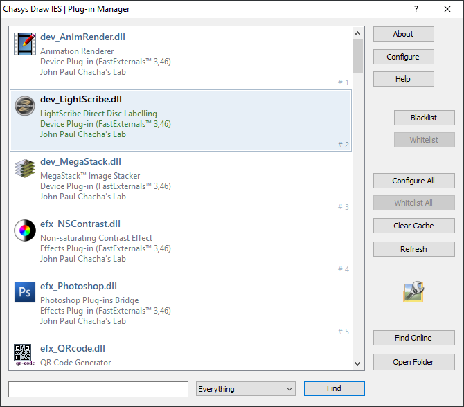 Plug-ins can be added or removed at any time, even if Chasys Photo is running. Plug-ins are available for use less than 30 seconds after being copied into the Plugins folder (or 2 minutes if the computer is running on battery). Also note that Chasys Photo may automatically blacklist plug-ins that exhibit rogue or dangerous behaviour; blacklisted plug-ins will not be used.